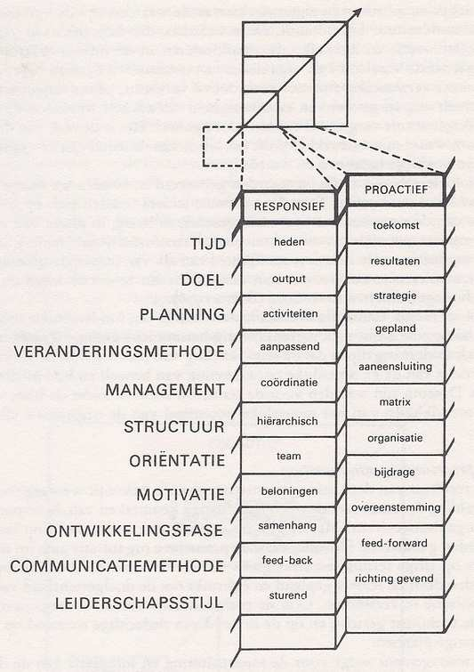De volgende stap na het nemen van het besluit van de organisatie om de Reactieve cultuur te verlaten, is op weg te gaan naar de schepping van de Responsieve cultuur! Dat wordt dus de het eerstvolgende doel! Een dergelijk besluit kan alleen in de top van de organisatie worden genomen. Door één of meerdere leiders die zelf tenminste het besef van het Responsieve cultuur hebben. De leidinggevende die verantwoordelijk wordt voor de uitvoering van het besluit zal het bijbehorende referentiekader hebben. Nog beter is het als de leiding zelf een Pro-actief referentiekader (profiel) zou hebben. Mensen die een top prestatieleverend profiel hebben staan nogal eens (te) ver weg van de alledaagse menselijke praktijk. Veelal zijn de verwachtingen dan naar medewerkers toe te hoog. Het voorleven van wat men van de medewerkers wil zien en horen is onontbeerlijk voor een succesvol verloop van de overgang die niet zonder weerstand zal verlopen. Ik ga ervan uit dat de Top van de organisatie een dergelijke leiding heeft.