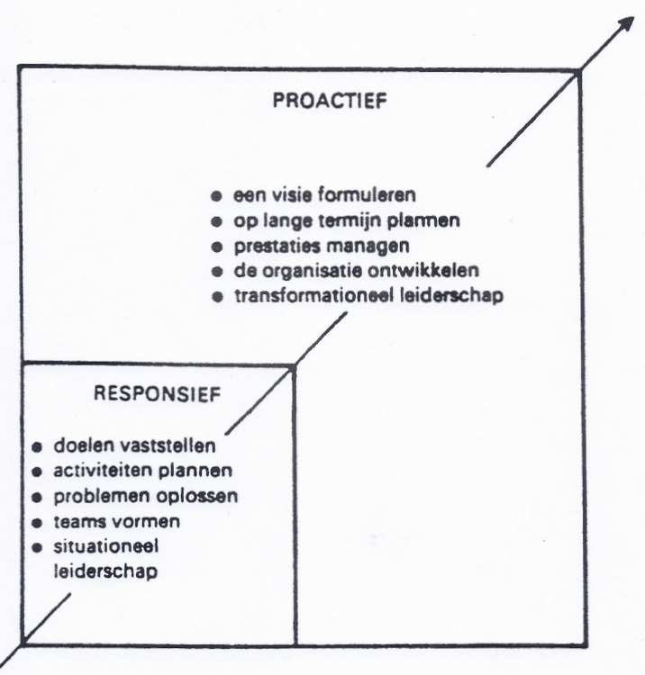 Mooi. Nu weten we weer aan welke criteria we moeten gaan voldoen als we de Proactieve fase in willen gaan. Wie een proactief referentiekader heeft (of ambieert), kijkt naar de toekomst en neemt initiatieven. De toekomst is een keuze die men zelf maakt. Er moet een visie op de toekomst komen! Daarin is de eerste belangrijke factor het waardesysteem van de organisatie. De gekozen toekomst moet passen in een algemeen aanvaarde visie die klopt met de waarden van de medewerkers. Op de tweede plaats moet die visie duidelijk maken dat de organisatie grote waarde hecht aan mensen. Medewerkers zullen dan het gevoel gaan krijgen dat de organisatie van hen is en dat de organisatie hen zowel zakelijke [werk] als op het persoonlijke vlak waardeert. De derde belangrijke factor is, dat er uit de visie op de toekomst een betrokkenheid moet spreken bij menselijke waarden die de medewerkers een diep, persoonlijk gevoel van voldoening geven. Een hoog doel kan alleen worden bereikt, als het gebaseerd is op waarden van een hogere orde. Een geaccepteerd waardesysteem van de organisatie kan werken als een leidraad voor individueel gedrag waardoor er minder behoefte is aan formele beleidslijnen, regels en voorschriften. De waarden moeten wel speciale waarden zijn! Zo zijn waarden die het gevoel van wederzijdse afhankelijkheid met de omgeving (zoals klanten) versterken, belangrijk voor het ontwikkelen van de wens om gewenste resultaten te boeken. Strategische lange termijn plannen dienen om de visie te verwezenlijken. T.b.v. de voortgang dient de leiding feedbacksystemen te maken die hen op de hoogte houden van belangrijke veranderingen en ontwikkelingen in de prestaties. De waarden vormen de lijm die de organisatie cultuur bijeenhoudt en zorgt voor een verdere aaneensluiting. De bijbehorende leiderschapsstijl noemen Nelson &Burns transformationeel. In de omgang met hun medewerkers zijn waarden heel belangrijk. Zij geven de gehele persoonlijkheid de aandacht die nodig is om zich verder te ontwikkelen. Transformattioneel leiders begrijpen dat de ontwikkeling van hun organisatie altijd een gevolg is van de gezamenlijke ontwikkeling van henzelf en die van hun medewerkers.