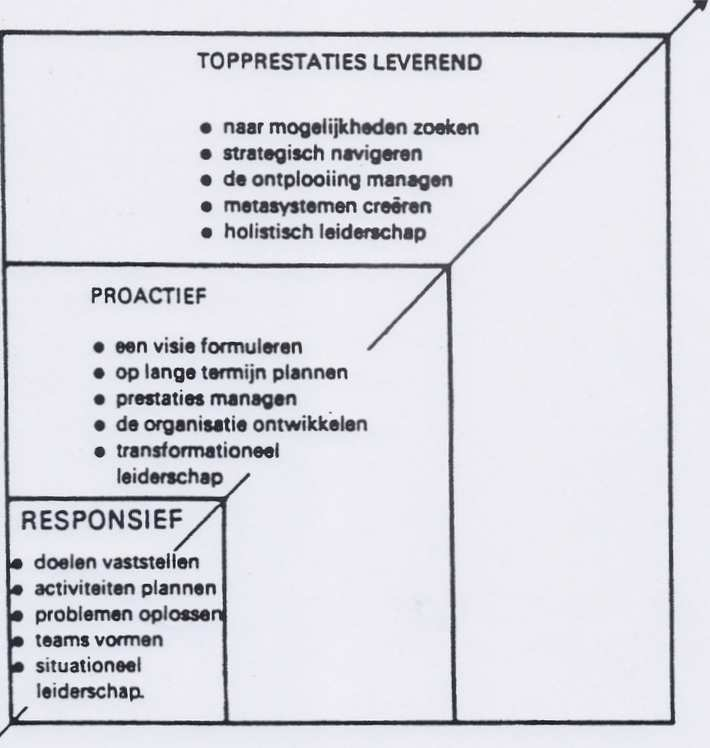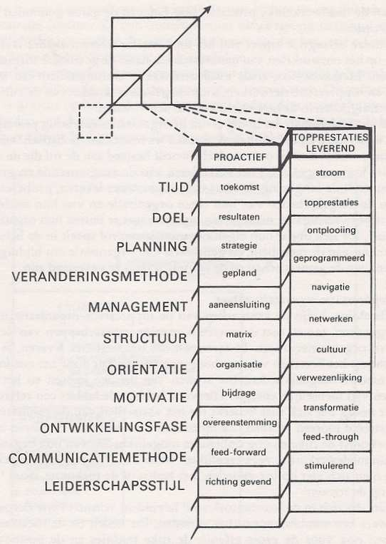 De leiding heeft een proactieve stijl [Pa]; gericht zijn op bereiken [Tw]; balans hebben tussen interne en externe waarden [It – Ex]; meer gericht zijn op opties dan procedures [Op]; gericht zijn wat wel voldoet [Ma]; meer invloed op de omgeving [Ilc]; meer gericht op globaal [Gl]; naast ontwikkeling wordt verandering belangrijker [Ch]; gericht op mensen [Pp]; gebruik maken van concepten [Co]; gericht op nabijheid en samen [Px – Tg]; de toekomst {Fu] en alle zintuiglijke kanalen [Vi –Au – Ki].