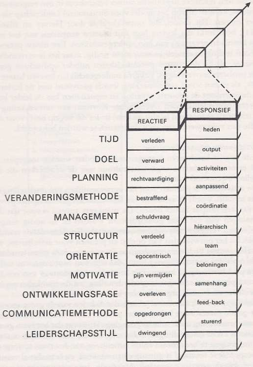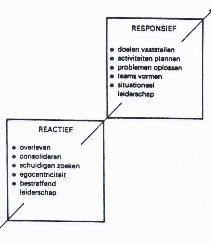 De overgang van het Reactieve naar het Responsieve referentiekader is volgens Nelson & Burns de meest veeleisende. Dit vanwege het bijzondere karakter van de Reactieve cultuur waar ontwikkeling praktisch onmogelijk is. Mensen vertonen daar defensieve reflexen als reactie op de dagelijkse gebeurtenissen. Pas als mensen in de organisatie ‘uit hun loopgraven’ komen en zich bezig gaan houden met een vorm van reflectie en zelfreflectie over het functioneren van de organisatie en van henzelf wordt ontwikkelen mogelijk. Dan zit men in de Responsieve fase. Zie afbeelding 3 hieronder.