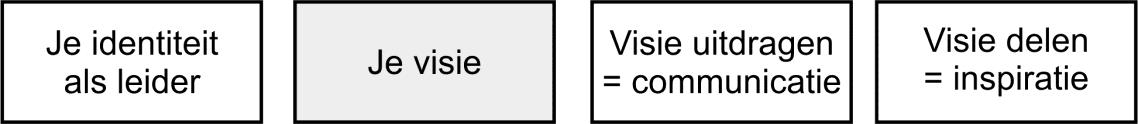 In deze definitie (zie schema hierboven) staat je visie centraal. Vanuit je visie kijk je naar factoren die je visie omringen: de basis voor de visie (je persoonlijke identiteit als leider), wat je als leider met de visie doet (uitdragen, d.w.z. communiceren) en het gewenste effect op anderen (de visie delen, d.w.z. inspireren).
